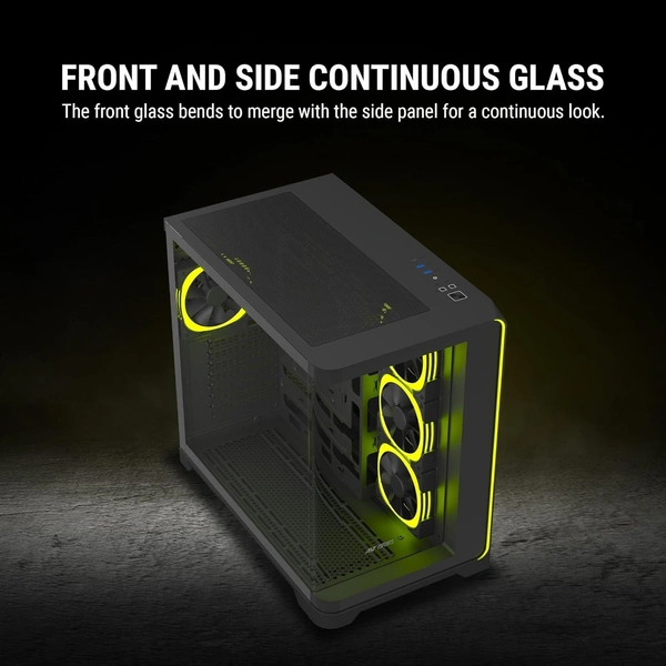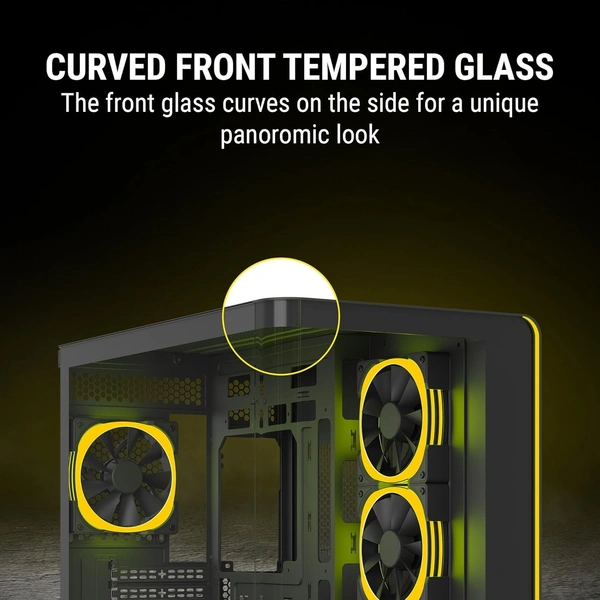 - Stylish Curved Glass Design: Featuring a toughened curved front glass panel, this case offers a seamless, panoramic view of your PC components, giving your setup an unmatched futuristic appeal.