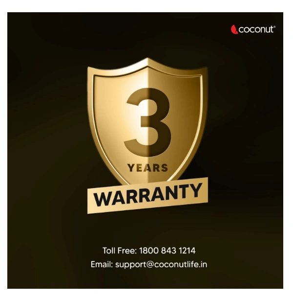 - 3 Years Warranty : Coconut provides 3 Years Warranty . Toll Free - 1800 843 1214 , Email - support@coconutlife.in