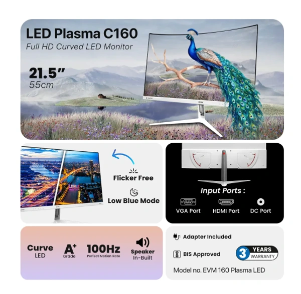 EVM Curved LED Monitor 22" FHD IPS 100Hz with HDMI | VGA | Speaker (160 Plasma LED)